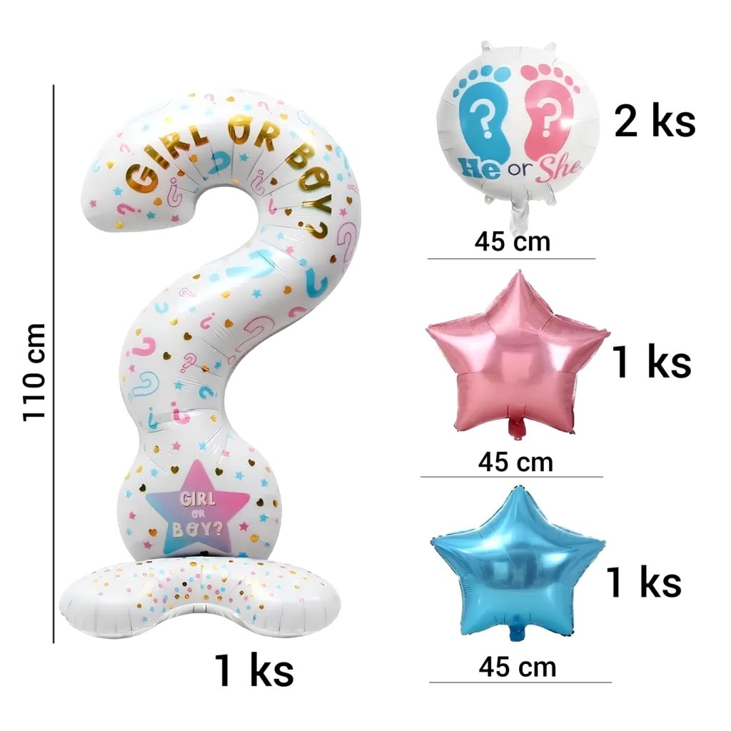 V balení 7 ks: 1 x velký Otazník, 1 x modrá hvězda, 1 x růžová hvězda, 2 x tlapky, 1 x GIRL, 1 x BOY