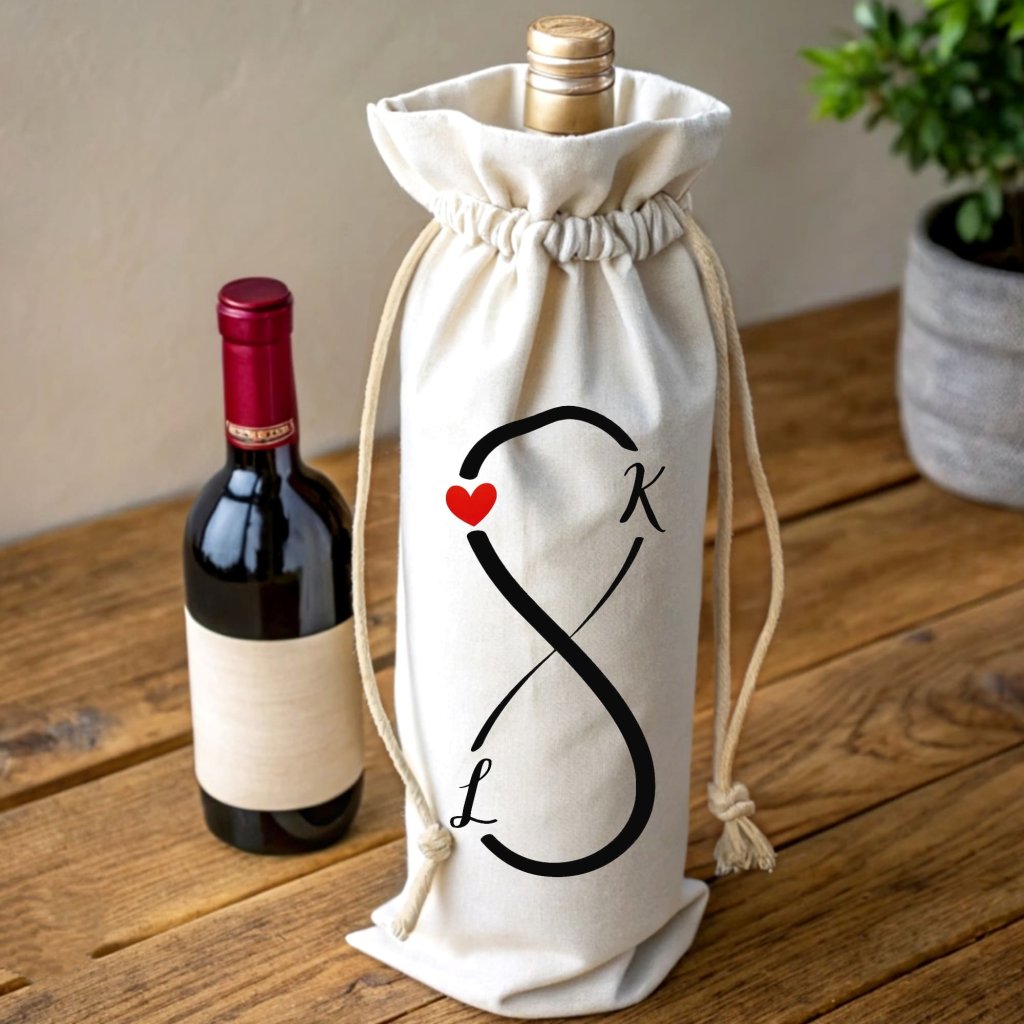 Personalizovaná taška na víno, slívku, rumíček, vodečku, prostě vše co teče a má tvar. S vlastními iniciály a srdcem, je ideální pro svatby, výročí, Valentýna nebo jen tak, když chcete potěšit někoho blízkého. Stačí doplnit první písmena jmen a vytvoříte jedinečný romantický obal na lahev, který udělá radost hned dvakrát – při pohledu i při otevření lahve.