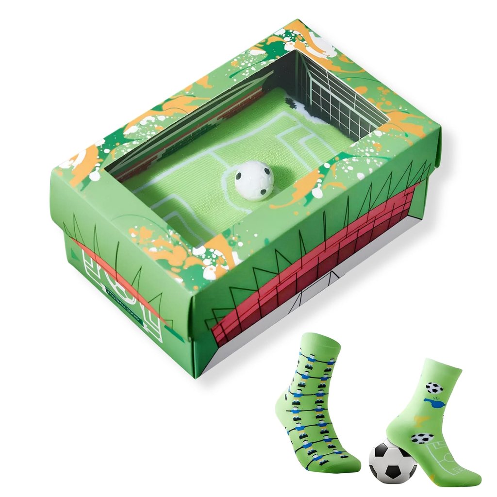 Krabička připomíná mini stadion, ponožky jsou složené tak, aby vytvořili efekt hřiště a uprostřed je dokonce i malý míček – ideální na vtipnou prezentaci. Uvnitř najdete jeden pár zelených ponožek s originálním motivem – fotbalové hřiště, míče, poháry a stolní fotbálek.