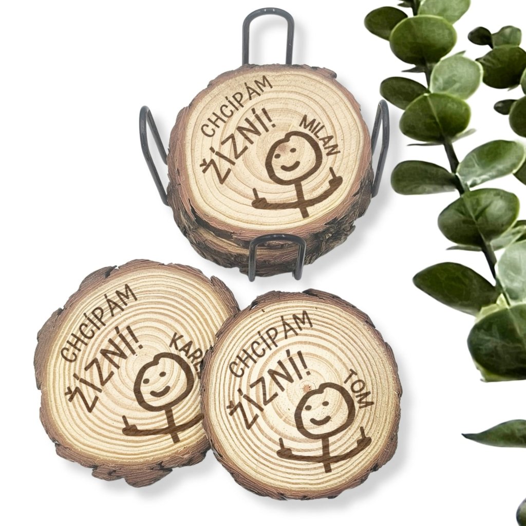 🪵 Vyrobený z přírodního dřeva o průměru cca 10–11 cm a tloušťce 1 cm, každý kus je originální s vlastním letokruhem a strukturou. Do středu laserem gravírujeme jednoduchý, vtipný motiv a nápis „Chcípám žízní!“, doplněný o vámi zvolené jméno.