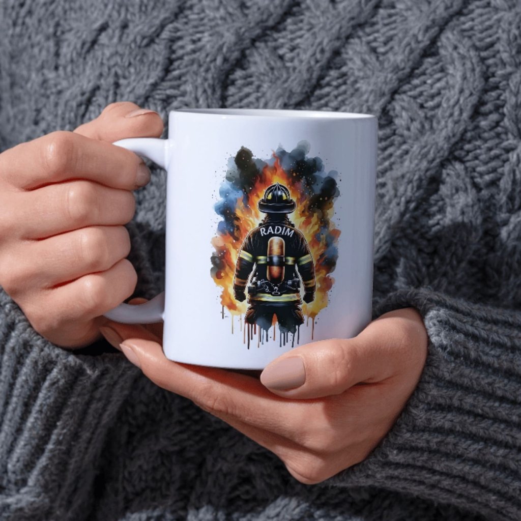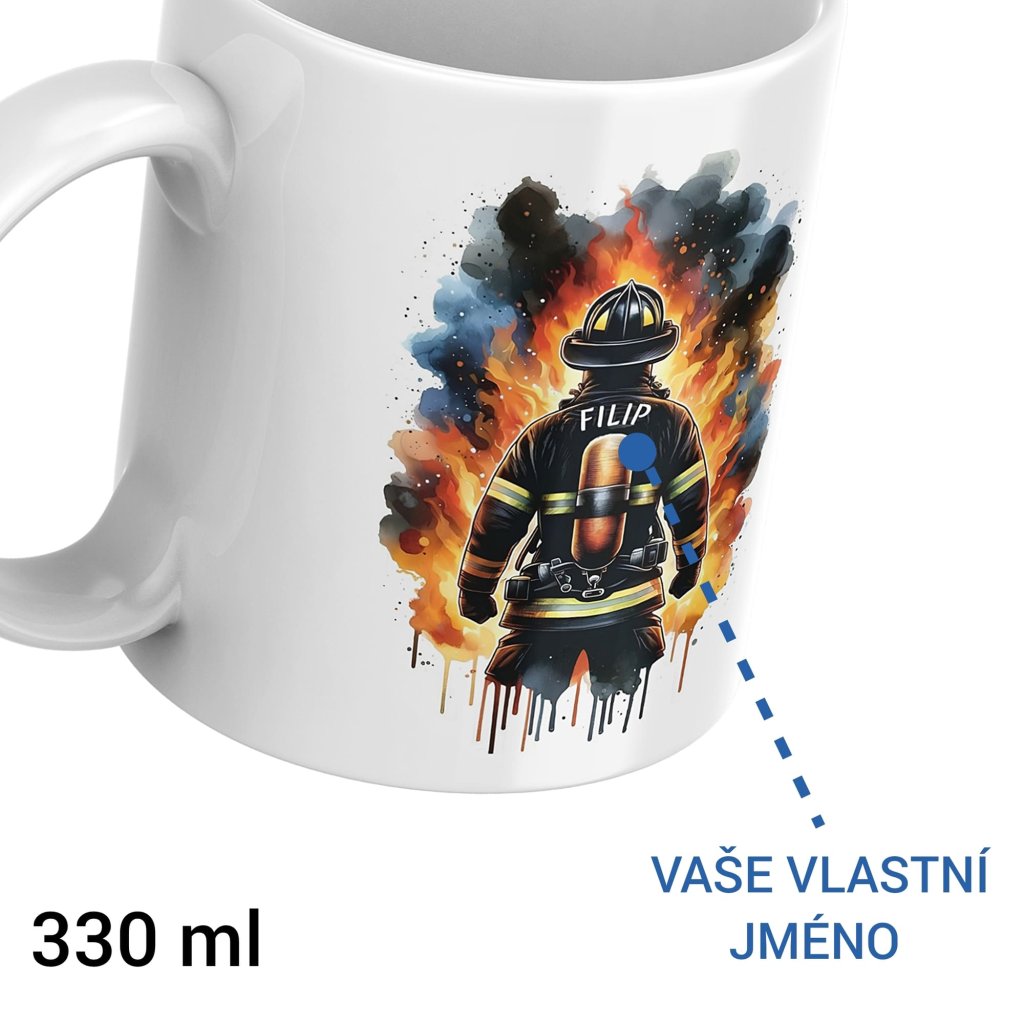 Dominantní ilustrace hasiče před plameny symbolizuje odvahu, nasazení a respekt. Jméno přímo na zádech dodá hrnku osobní význam – žádná anonymní dekorace, ale hrnek, který patří konkrétnímu člověku.