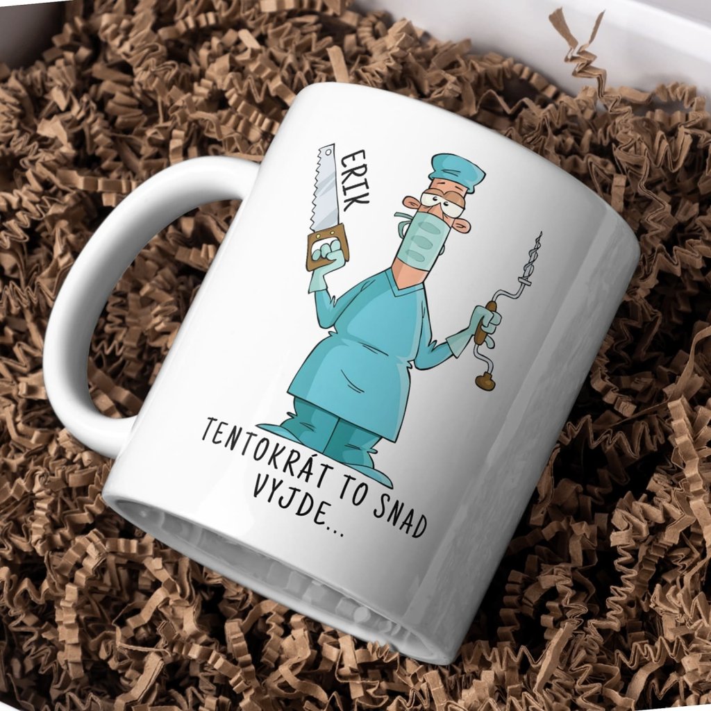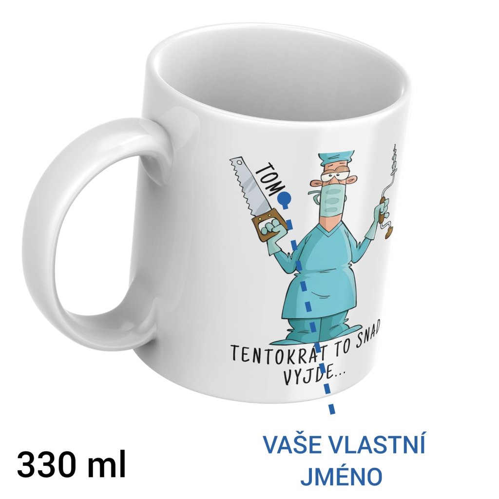 Lehce ironický nápis „Tentokrát to snad vyjde…“, stylová ilustrace chirurga a vlastní jméno z něj dělají perfektní dárek.