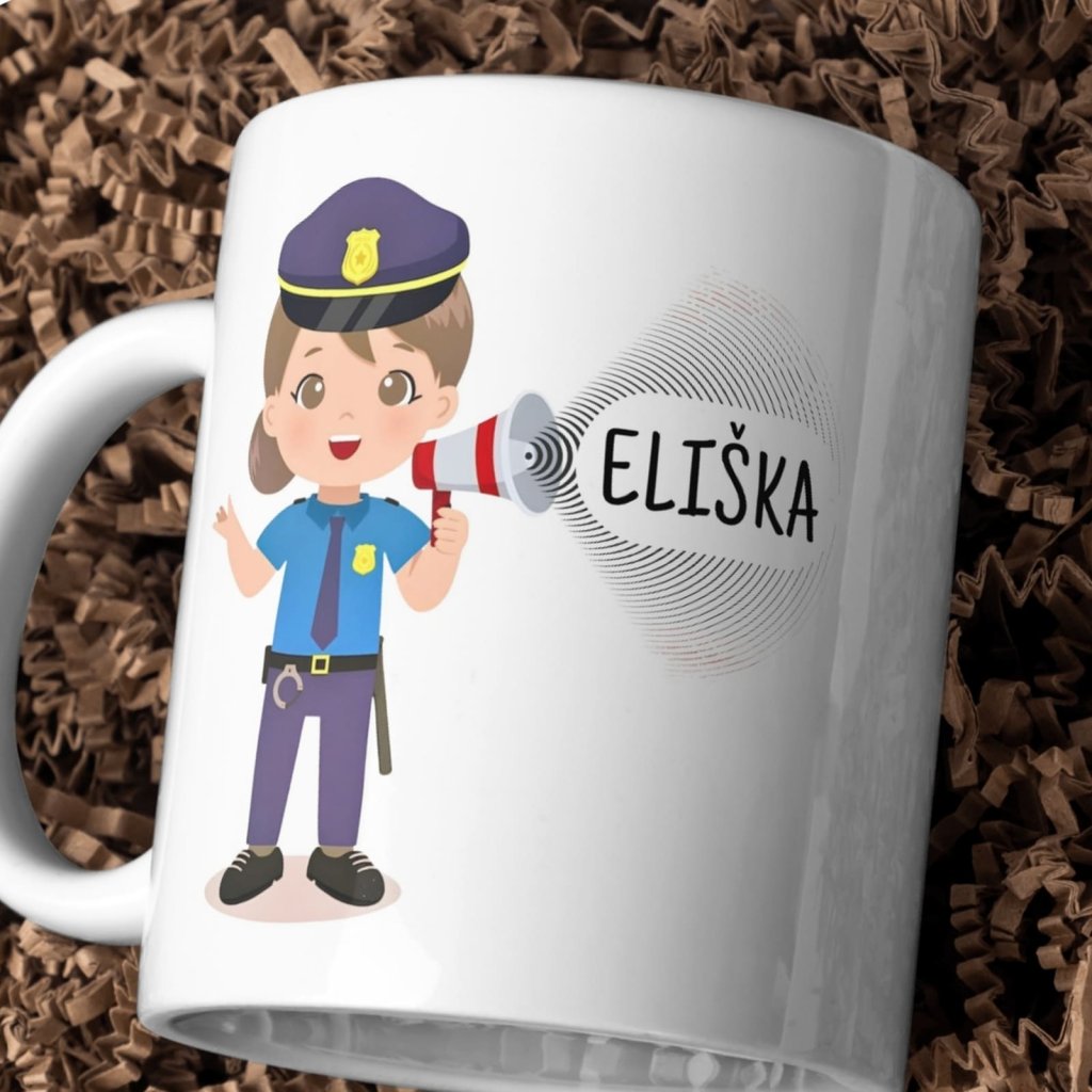 Tenhle hrnek je jako stvořený pro policistky, které mají pořádek nejen ve městě, ale i v ranním režimu. Ilustrace s megafonem dává dokonalý prostor pro jméno nebo vlastní text – vtipný, drsný nebo přesně podle reality služby.