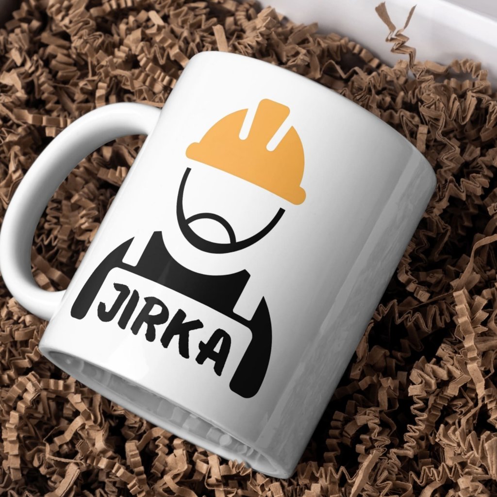 Minimalistický motiv stavaře s helmou doplněné o vlastní jméno, takže vznikne originální dárek pro kolegu, tátu, bráchu nebo kámoše.