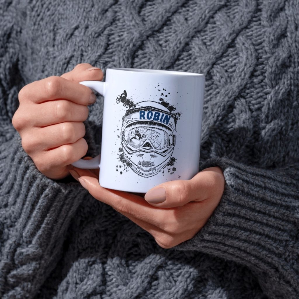 Detailní ilustrace motokrosové helmy v kombinaci s dynamickým splatter stylem dává hrnku syrový, akční charakter.