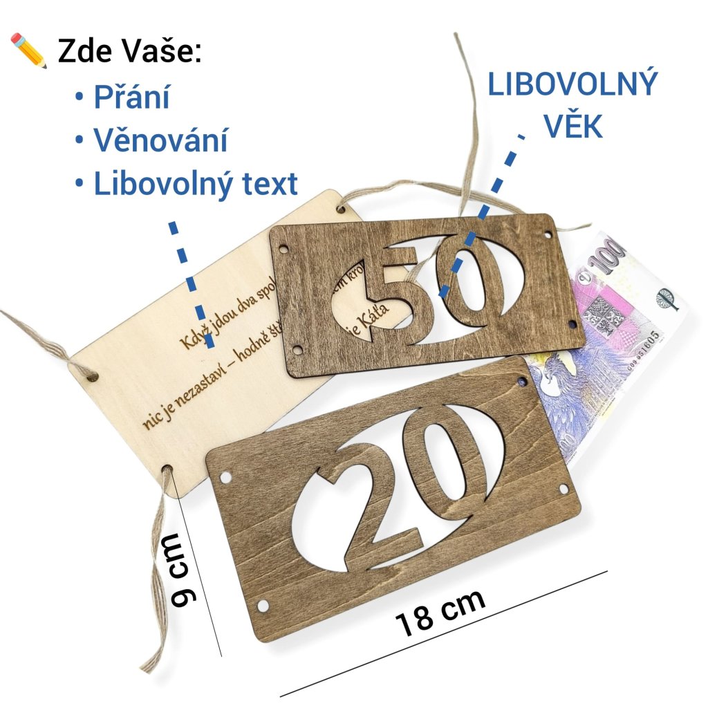 Stylové dřevěné přání s vylaserovaným věkem a textem, kam vložíš bankovku – originální dárek, co konečně nepůjde do šuplíku. Vlastní věk + vlastní text uvnitř.