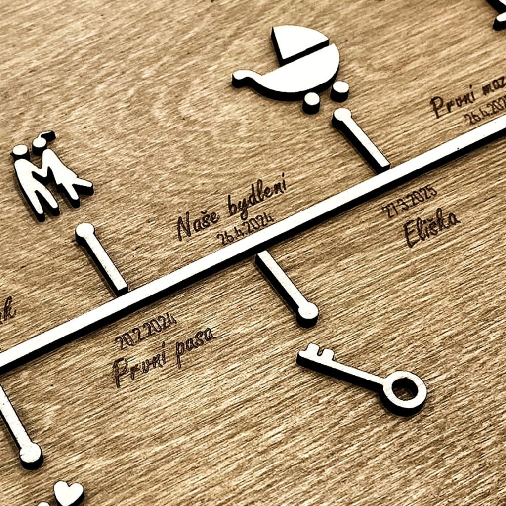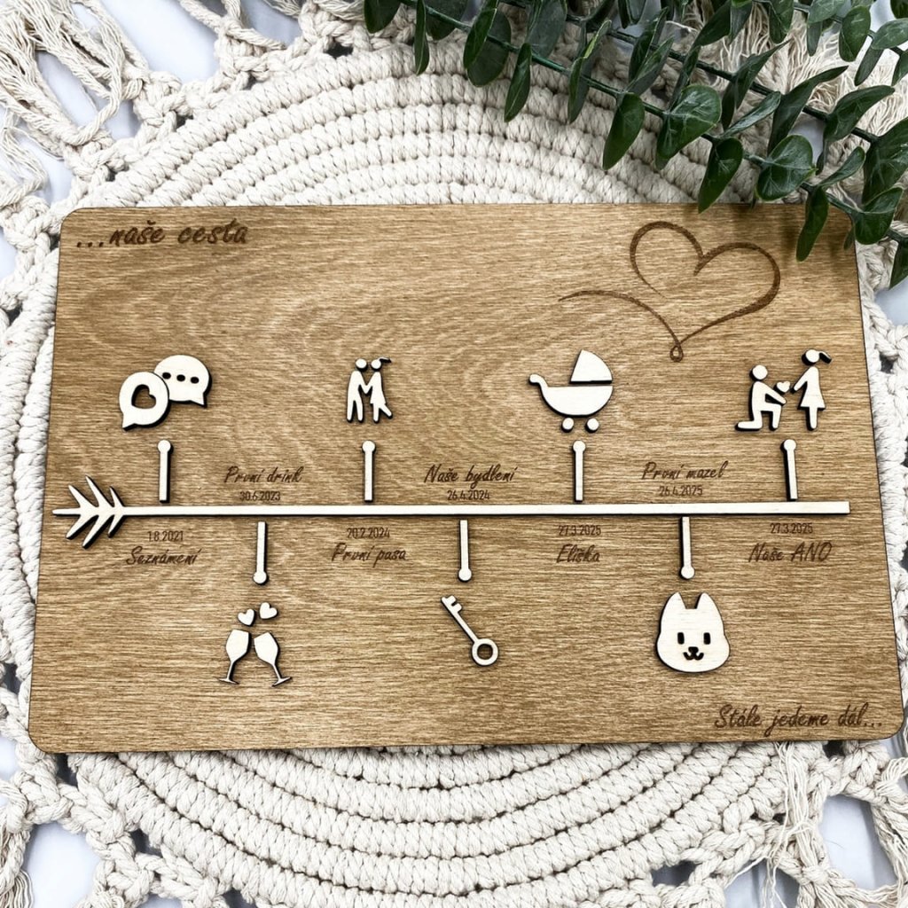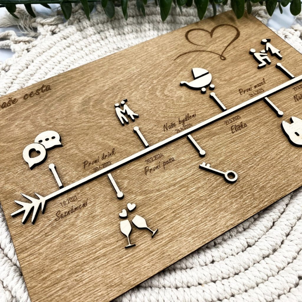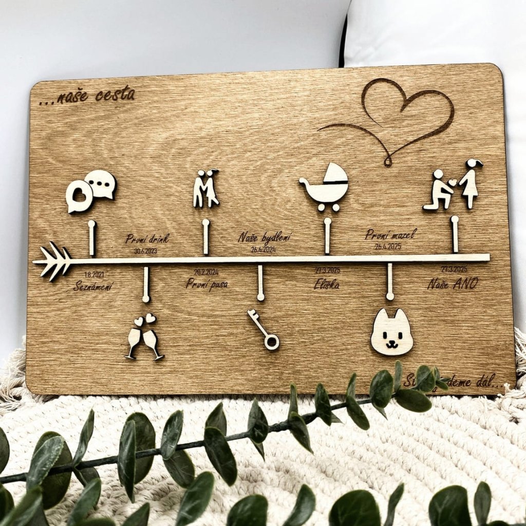 Do dřeva vdechneme Vaši společnou cestu životem, jako dárek pro milovanou osobu. Do poznámky napište 7 Vašich společných osudových momentů (ke každému z nich přiřadíme příslušnou symboliku). Pište ve tvaru: Datum; událost