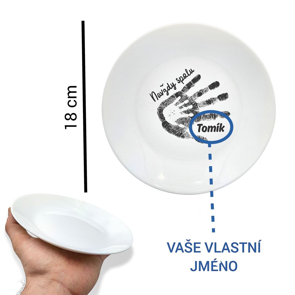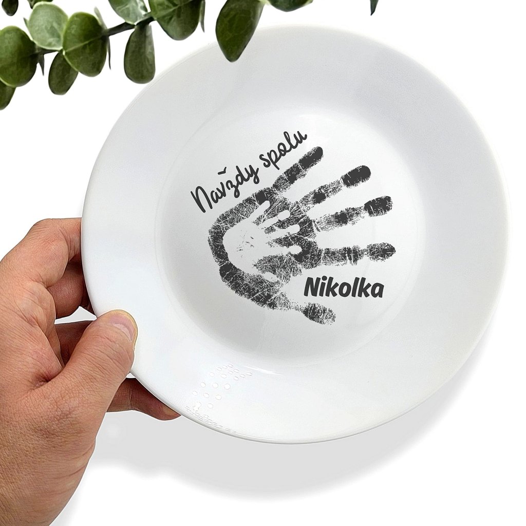 Na tomhle keramickém talíři se potkává otisk dospělé a dětské dlaně, doplněné o vaše vlastní jméno.