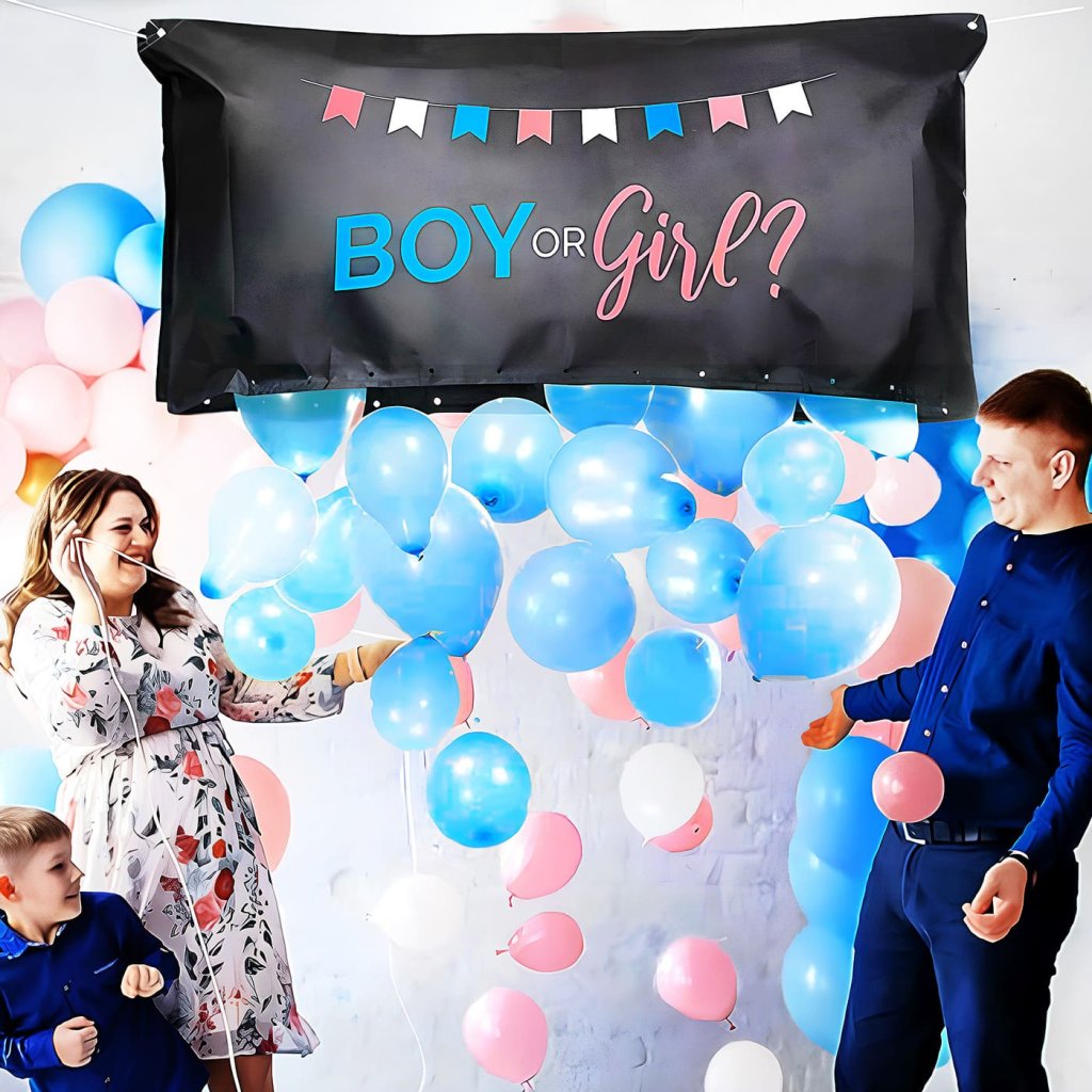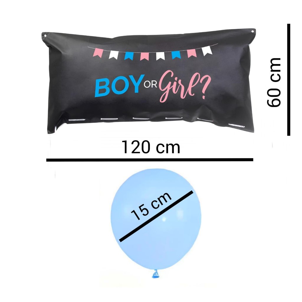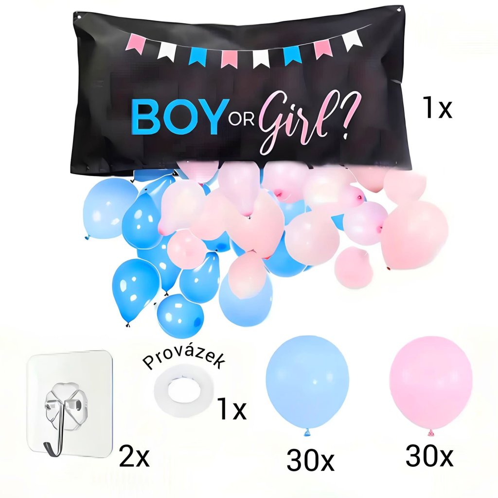 Do velkého černého pytle s nápisem Boy or Girl? stačí vložit připravené balónky (v setu najdete obě barvy – růžovou i modrou), zavěsit a v ten správný okamžik jen zatáhnout za provázek. A pak už sledujete, jak se místnost zaplaví barvou, která prozradí velké tajemství.