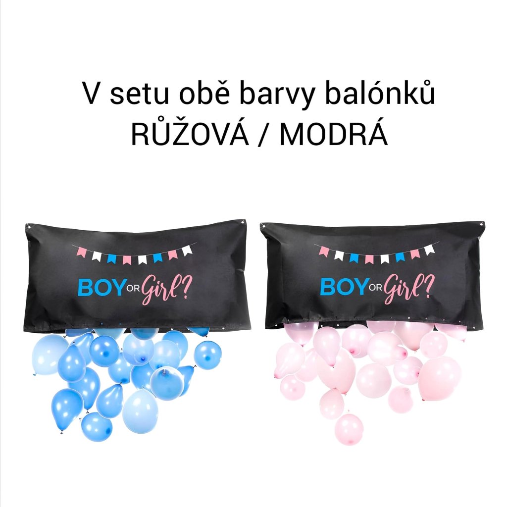 V setu: 1x Pytel na balónky, 30 x balónek - modrý, 30 x balónek - růžový, 2x háčky na stěnu, 1x provázek