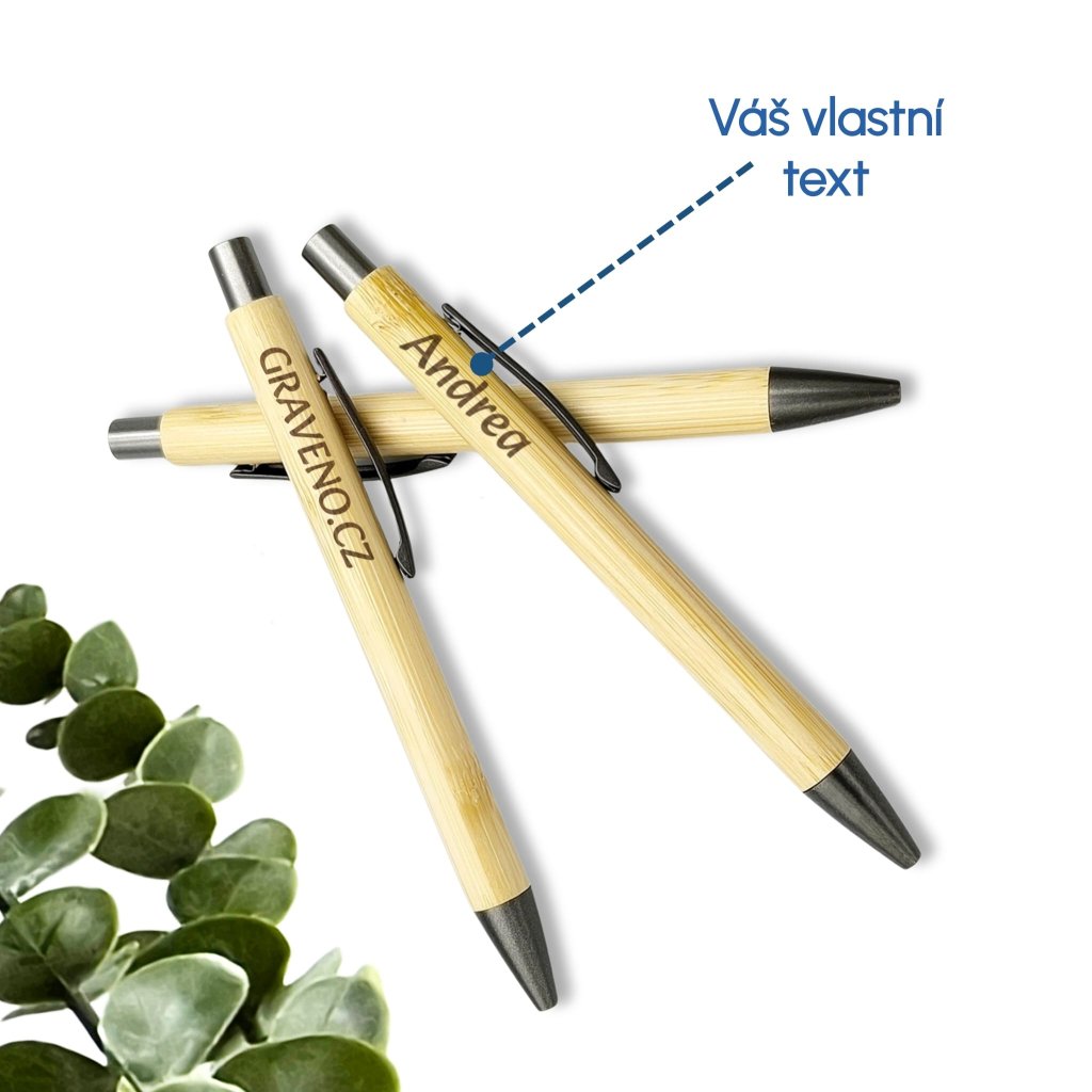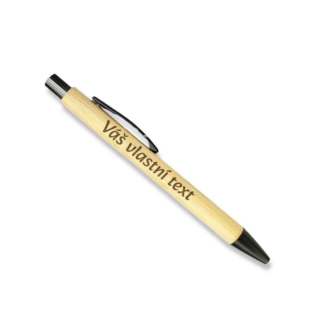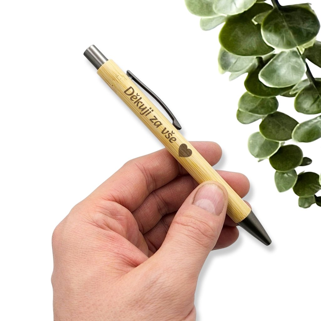 Bambusová propiska vypadá elegantně, píše krásně a hlavně – může mít na sobě vlastní text, jméno, věnování nebo třeba vtip, který pochopí jen jeden člověk na světě.