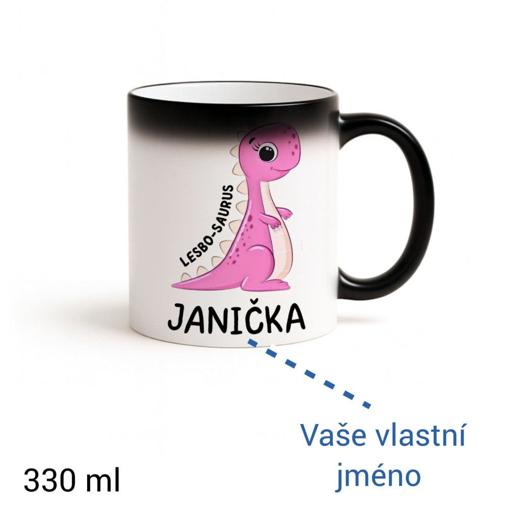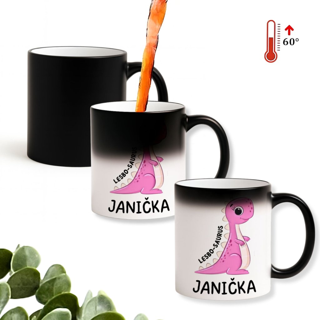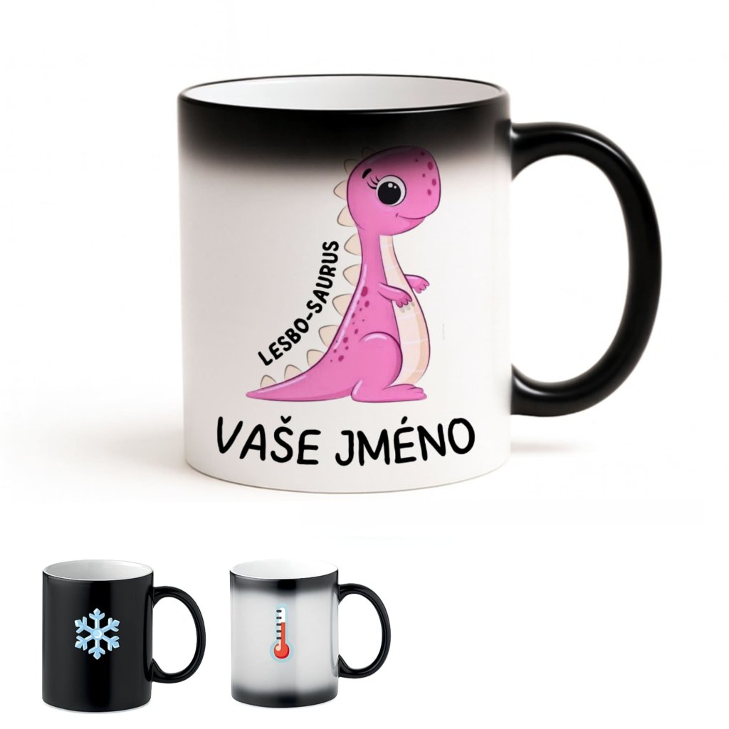 Tahle keramická potvora je v klidu černá, dokud do ní nenaliješ horký nápoj. Pak se stane kouzlo – odhalí se růžový LESBO-SAURUS i se jménem, které mu dáš.