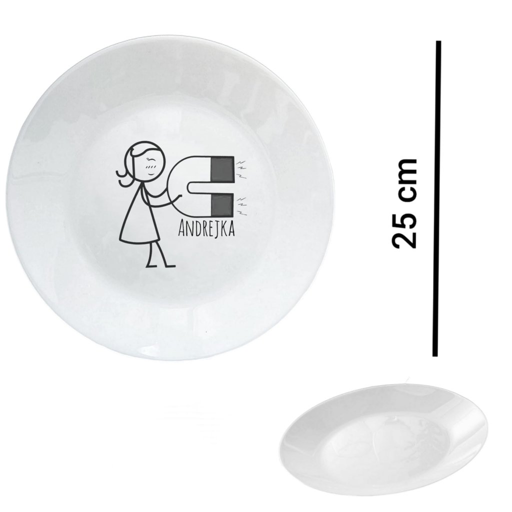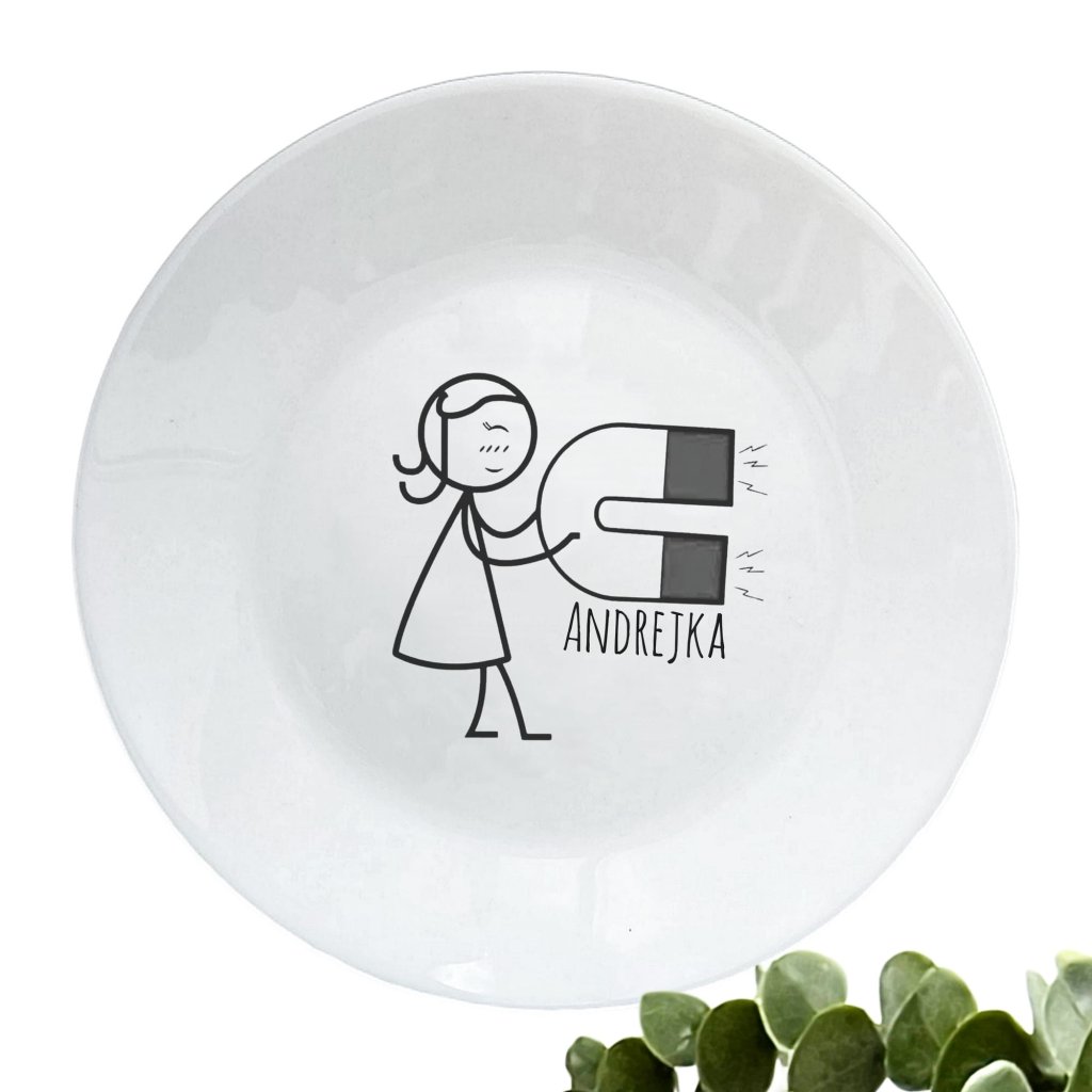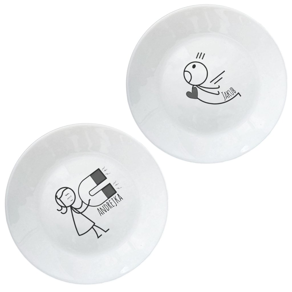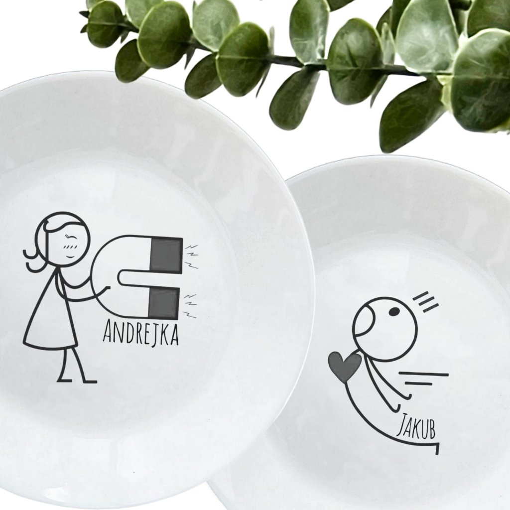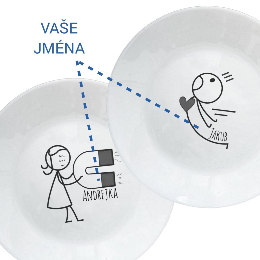 Na jednom talíři je ona s obřím magnetem, na druhém on letící srdcem přímo k ní – a vaše jména tomu dají tu správnou jiskru.