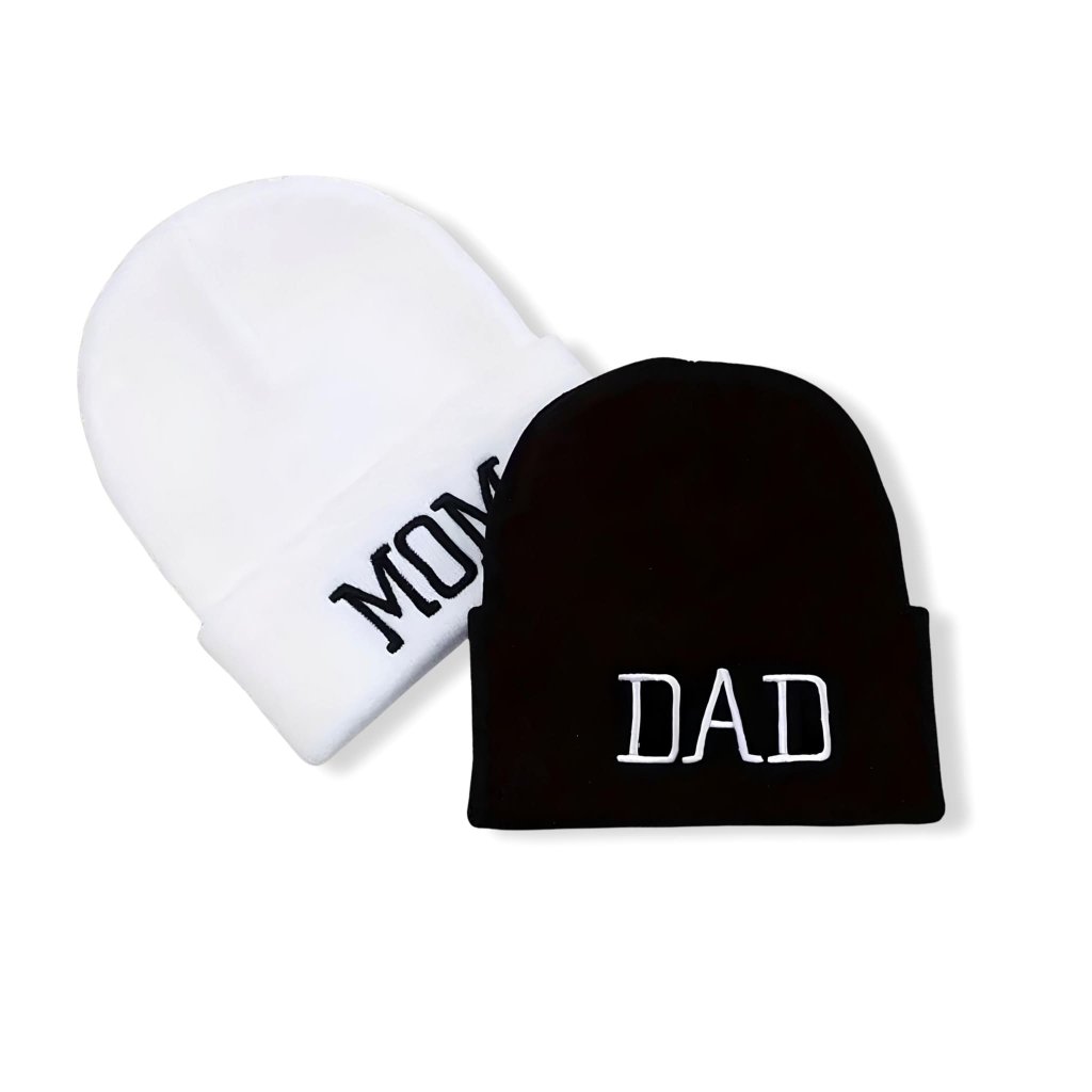Černá čepice pro tátu, bílá pro mámu, vyšívané nápisy MOM & DAD – jednoduchá, elegantní kombinace, která mluví sama za sebe.