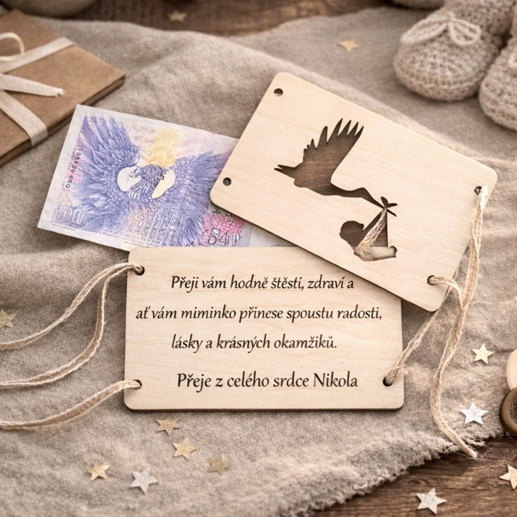Zapomeňte na obyčejné obálky. Tohle je dárek, který si novopečení rodiče opravdu nechají. Dřevěné přání s motivem čápa chytře ukryje bankovku přímo do designu – a vytvoří tak efekt, který každého překvapí už na první pohled.