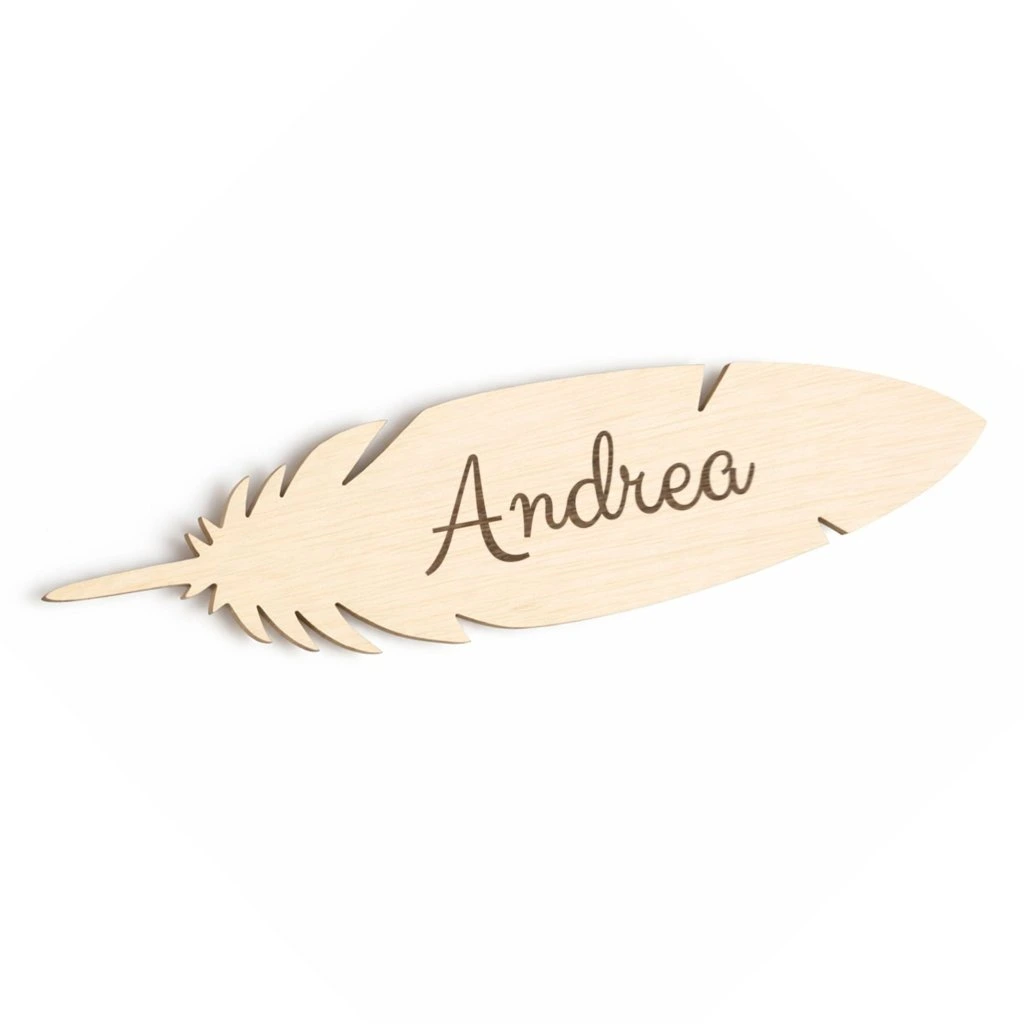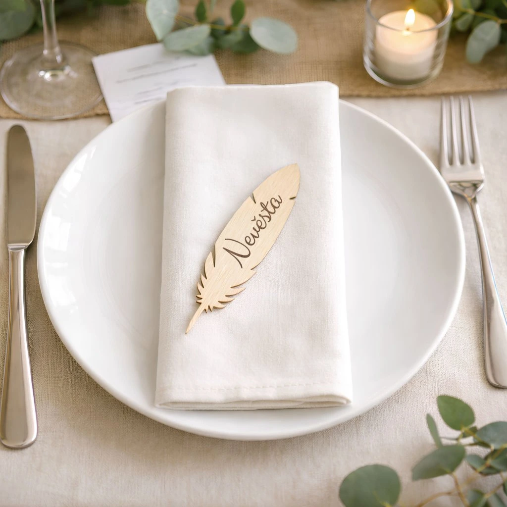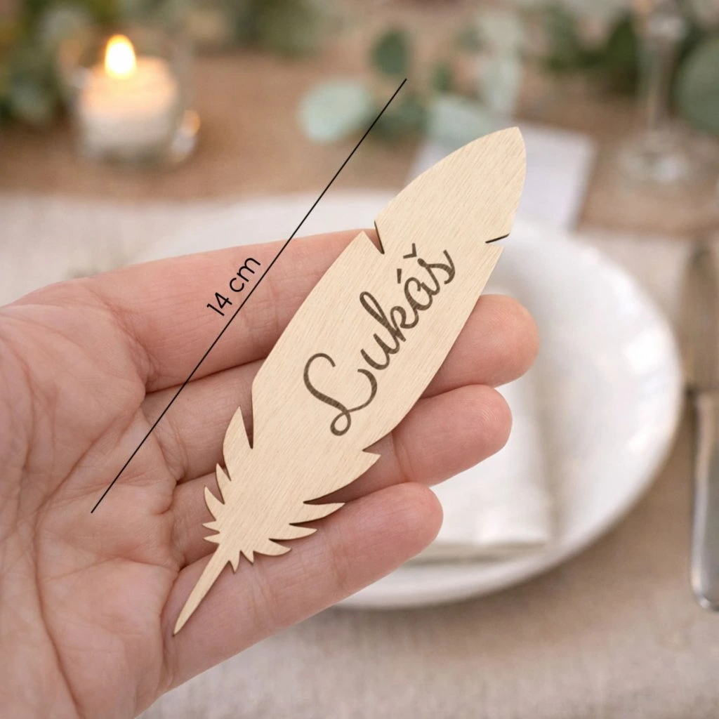 Dolaďte svatební tabuli do posledního detailu pomocí dřevěných jmenovek ve tvaru pírka. Každá jmenovka je vyrobena z kvalitní překližky a jméno hosta je do ní přesně vygravírováno laserem.