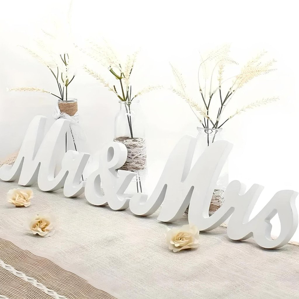 Tenhle dřevěný nápis Mr & Mrs je přesně ten typ dekorace, který okamžitě vytvoří svatební atmosféru.