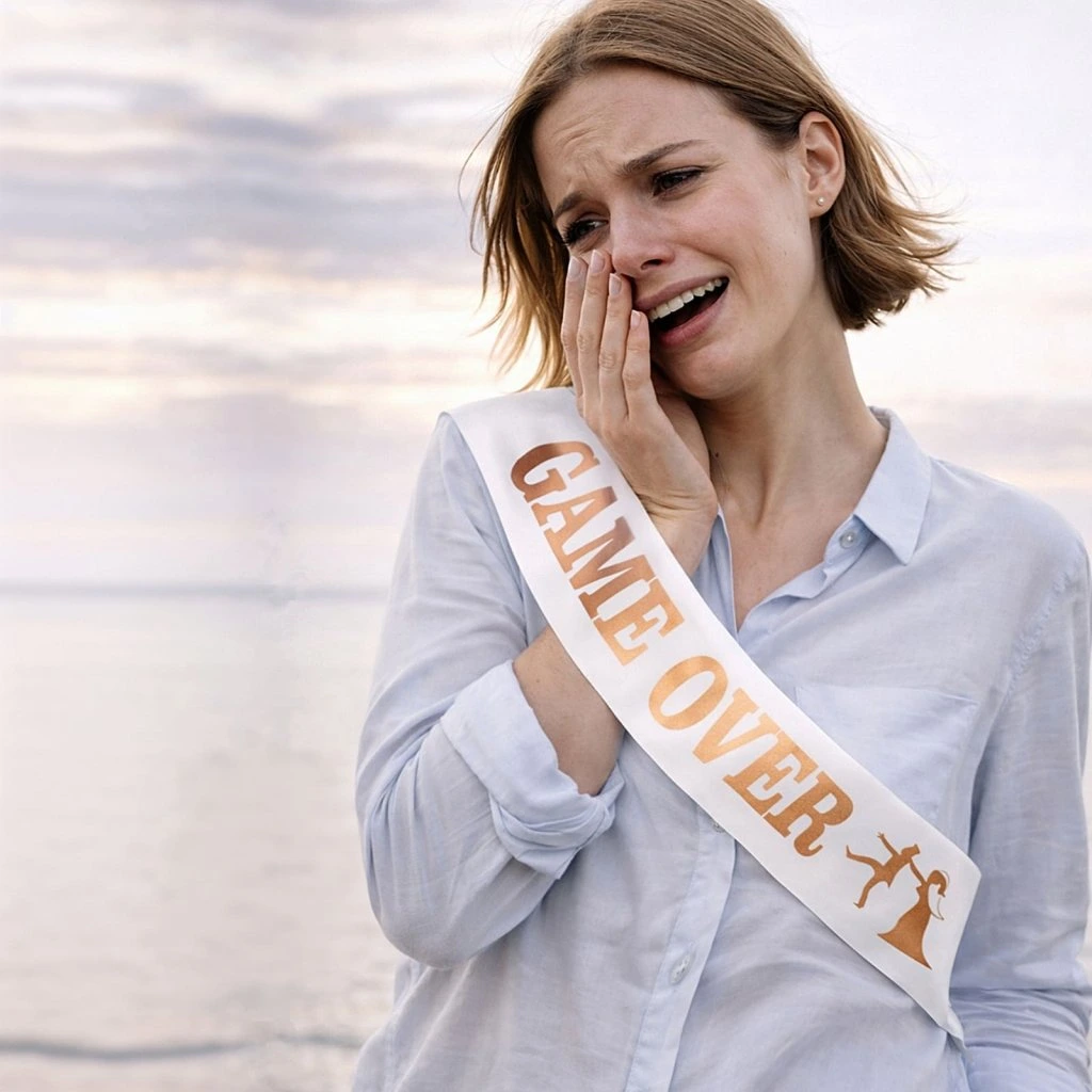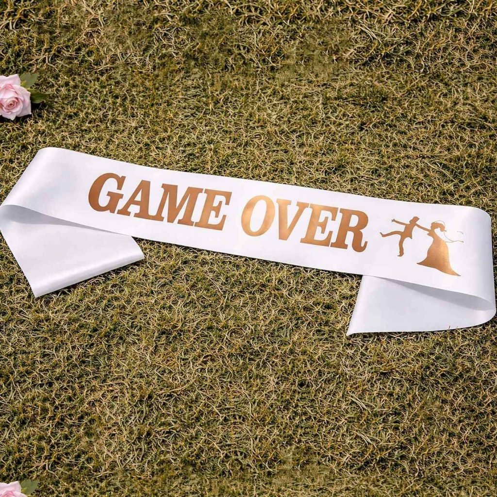 Šerpa Game Over je ikonický doplněk na rozlučku se svobodou, který dá jasně najevo, že se něco velkého blíží. Elegantní kombinace bílé a zlaté působí stylově, ale zároveň zábavně.