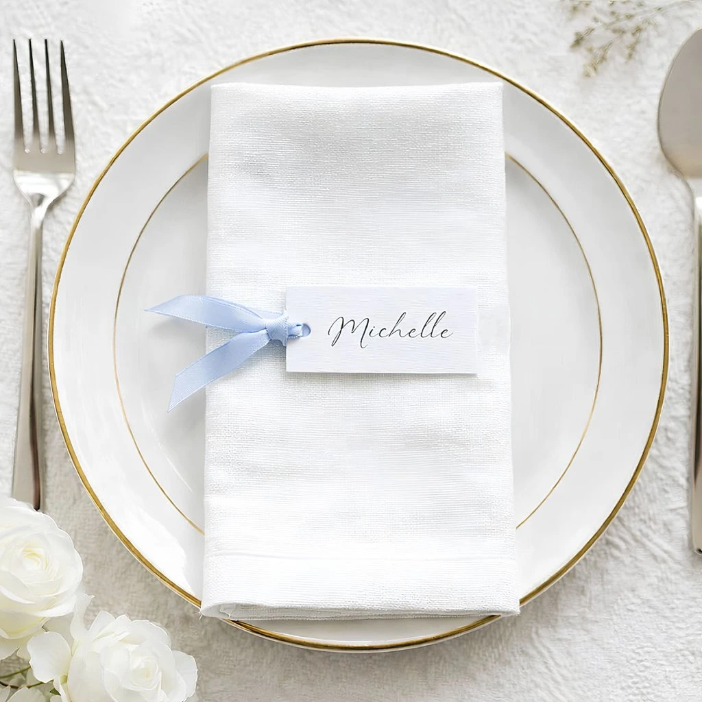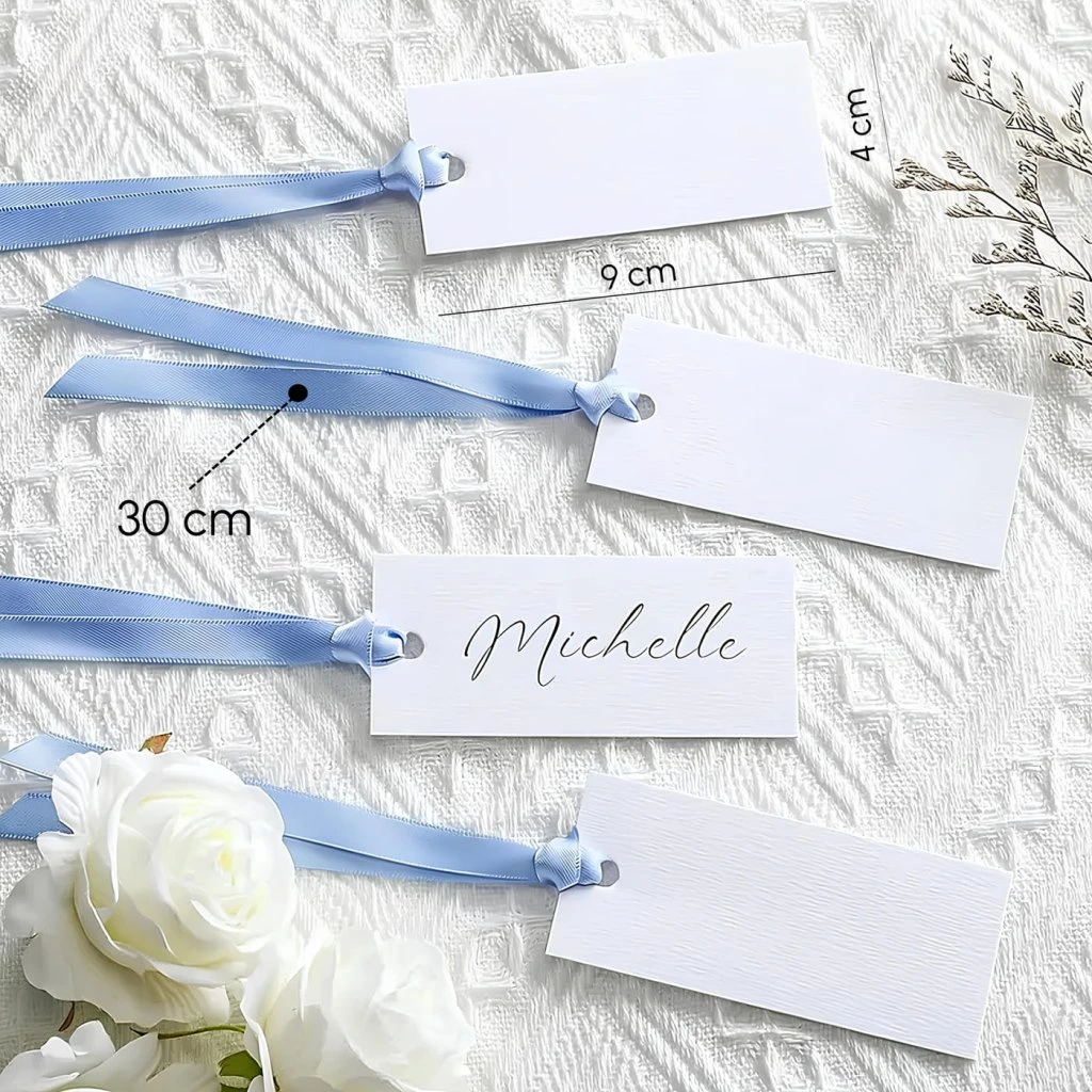 Jmenovky jsou prázdné, takže na ně jednoduše dopíšete jména hostů podle svého stylu – fixem, kaligrafickým perem nebo tenkým markerem. Stačí jmenovku položit na talíř nebo ke skleničce a hosté okamžitě poznají, kde mají své místo.