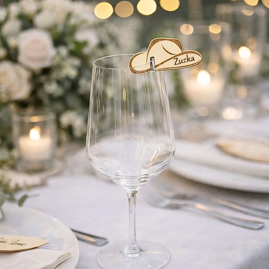 Jmenovka ve tvaru klobouku se krásně vyjímá na okraji skleničky a zároveň slouží jako originální dekorace i praktické označení místa. Díky svému přírodnímu vzhledu skvěle doplní rustikální, boho i přírodní svatbu.