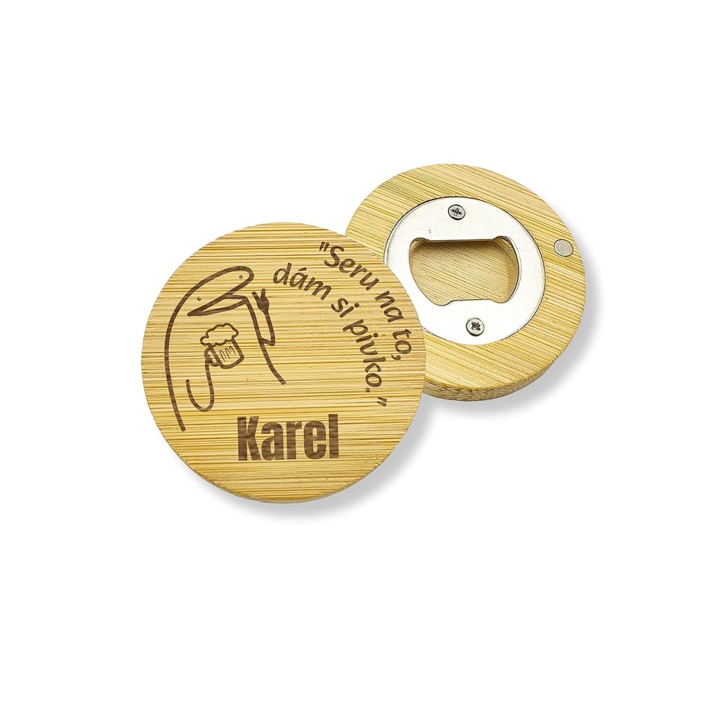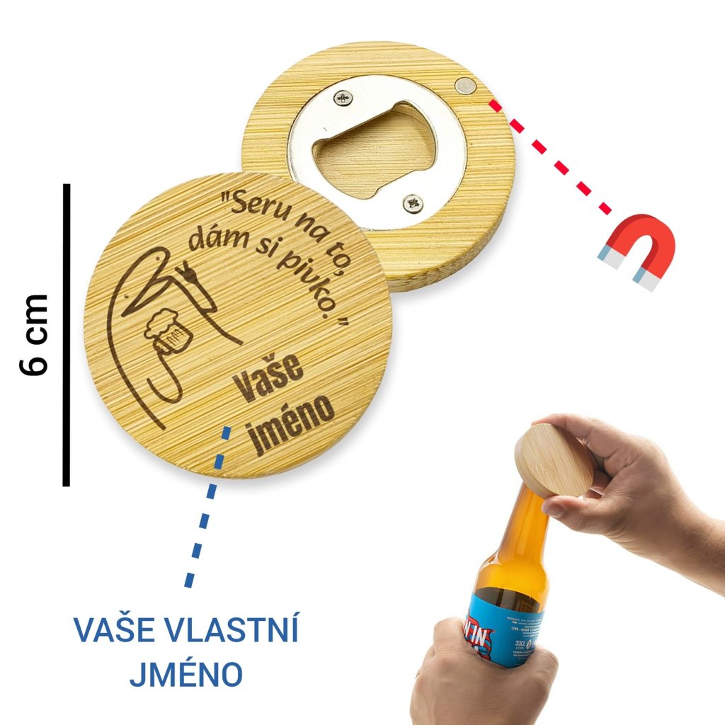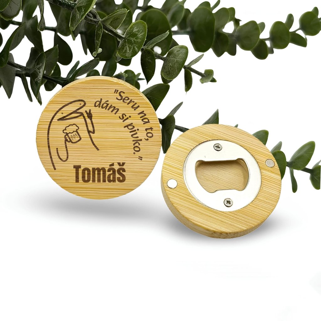 Bambus + kov, magnet na lednici a gravírovaný text „Seru na to, dám si pivko“ + tvoje jméno. Originální, praktický a přesně pro ty, co ví, že pivo je občas řešení.